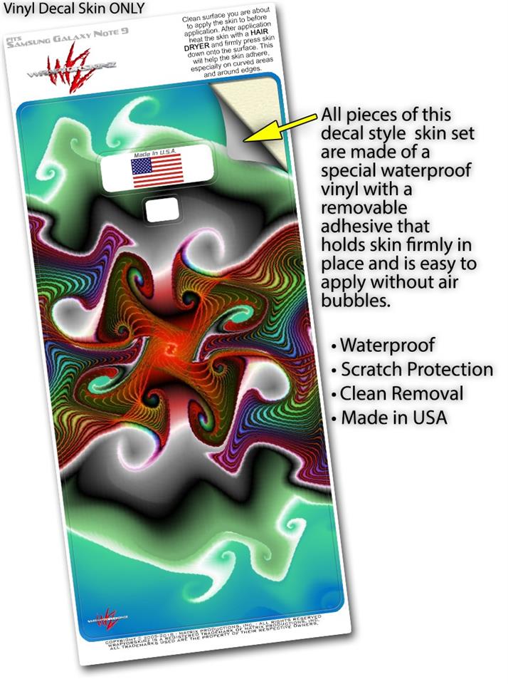 WraptorSkinz® skin wraps for the Samsung Galaxy Note 9 are printed using superb photo quality designs and vibrant colors printed with special fade resistant inks that last even in direct sun for years. WraptorSkinz are a composite of two layers of commercial grade materials. The bottom layer is a soft, flexible vinyl with a special removable adhesive that is easily positioned, applied without air bubbles. Next, we print the bottom layer with UV protected, fade resistant inks that deliver superb photo quality designs in vibrant colors. Finally, we bond a professional grade laminate over the entire Galaxy Note 9 skin adding a glossy protective finish. This product is not affiliated with or endorsed by Samsung.