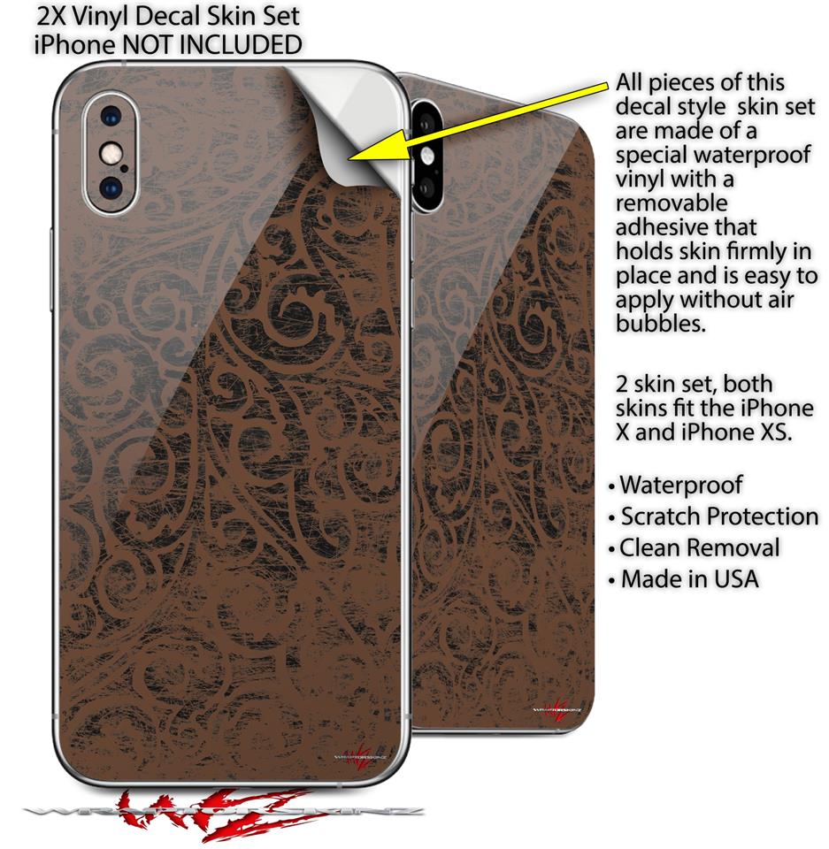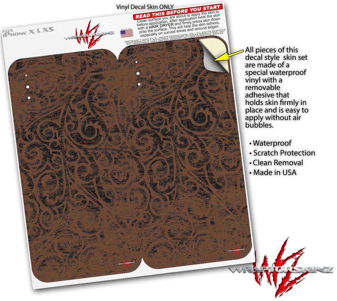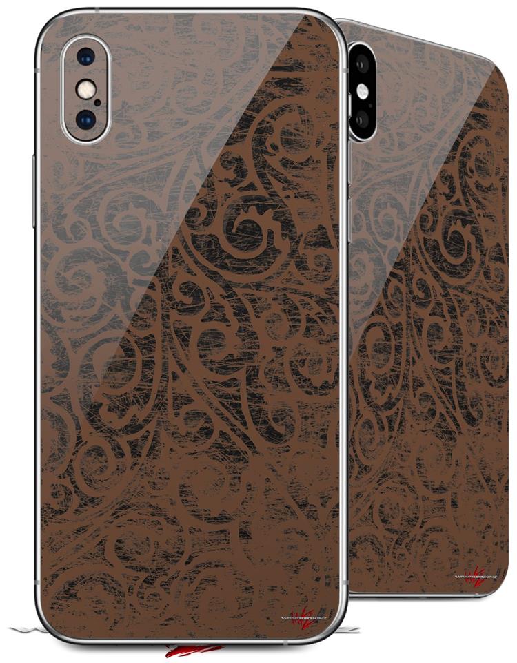 2 Decal style Skin Wraps set for Apple iPhone X and XS Folder Doodles Chocolate Brown