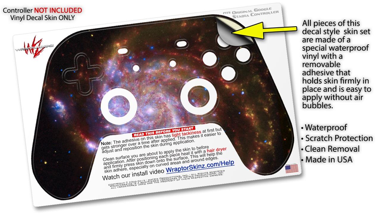 This product is in no way affiliated with or endorsed by Google. WraptorSkinz® skin wraps work with the Original Google Stadia version 1 Controller. Printed using superb photo quality designs and vibrant colors printed with special fade resistant inks that last even in direct sun for years. WraptorSkinz are a composite of two layers of commercial grade materials. The bottom layer is a soft, flexible vinyl with a special removable adhesive that is easily positioned, applied without air bubbles. Next, we print the bottom layer with UV protected, fade resistant inks that deliver superb photo quality designs in vibrant colors. Finally, we bond a professional grade laminate over the entire skin adding a glossy protective finish.