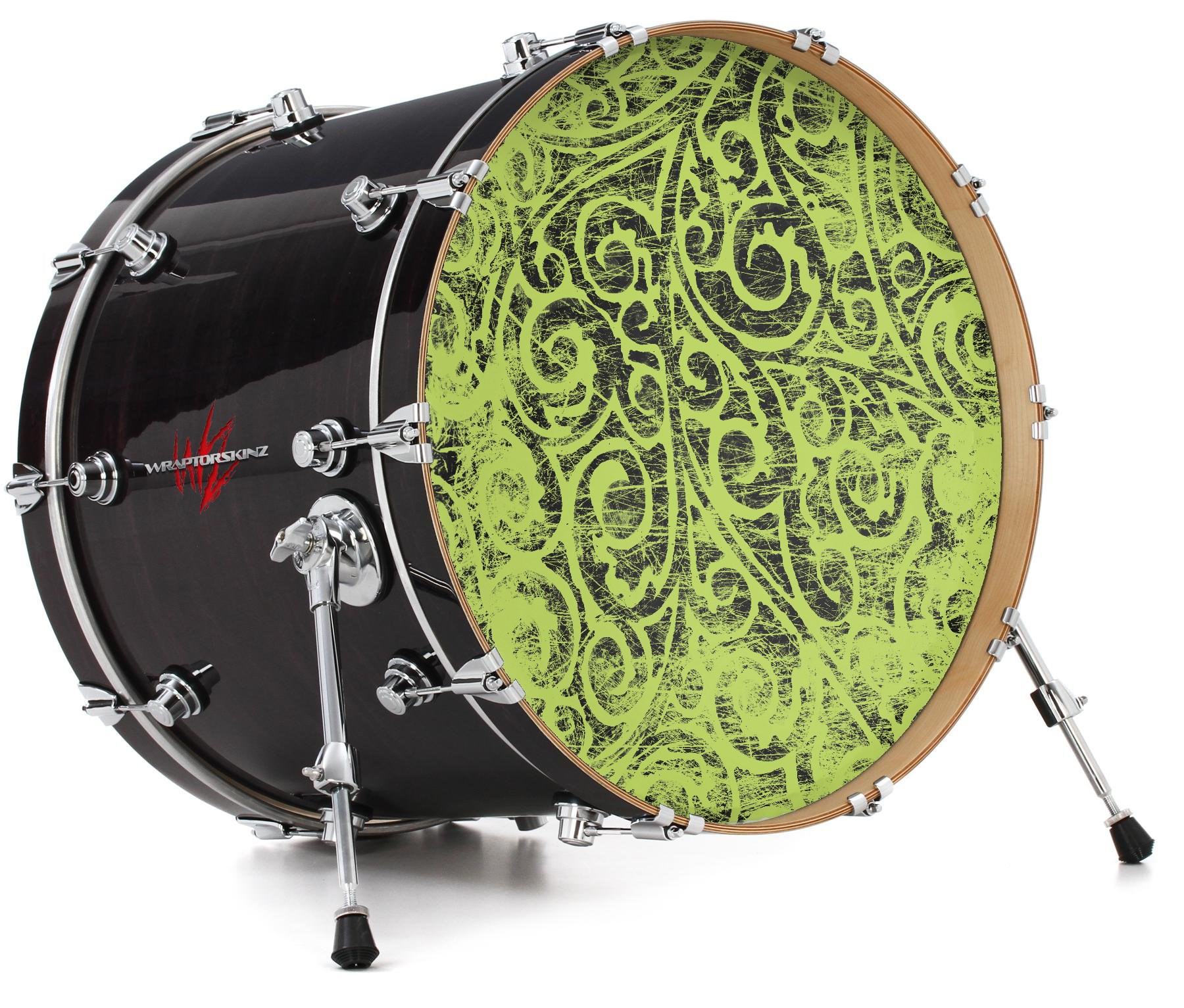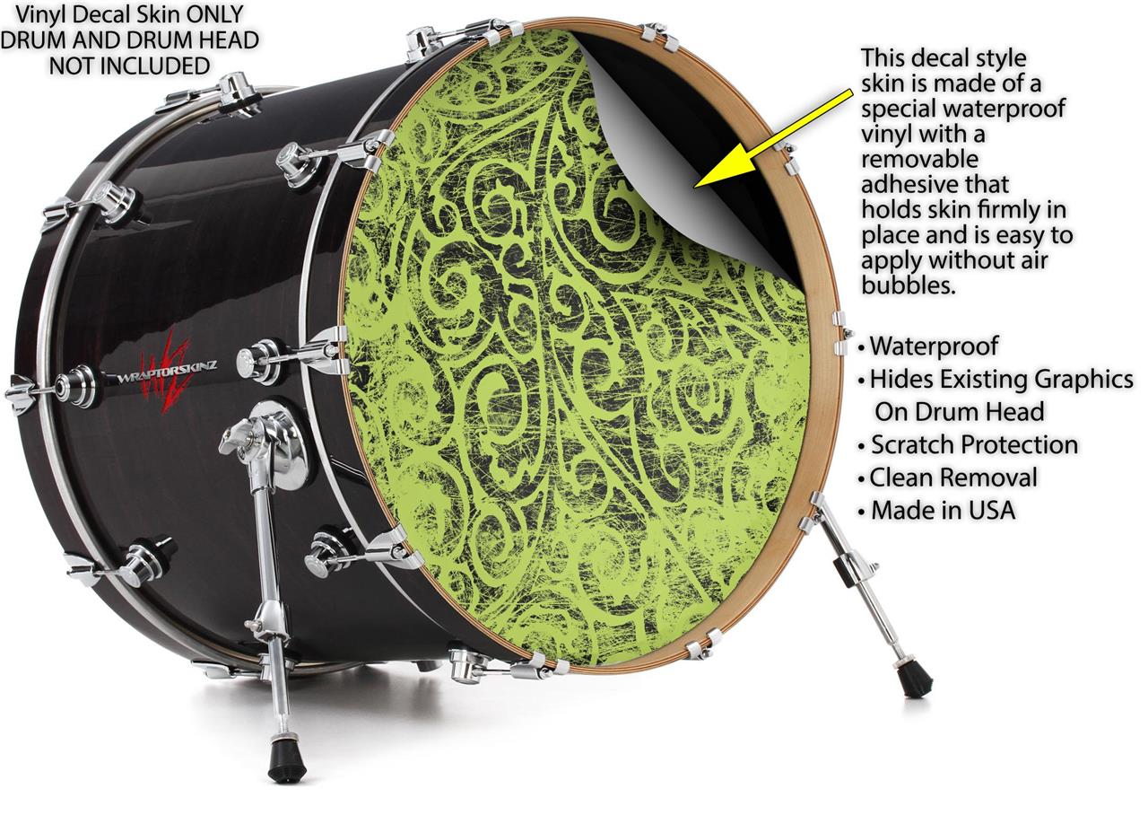 This design also available in other sizes. WraptorSkinz® skin wraps compatible with most kick drum heads. Printed using superb photo quality designs and vibrant colors printed with special fade resistant inks that last even in direct sun for years. WraptorSkinz are a composite three layer commercial grade materials vinyl. The bottom layer is a air release, grey block out removable adhesive that hides existing graphics on the drum head and is easily applied without air bubbles. The middle layer is a flexible vinyl printed with UV protected, fade resistant inks that deliver superb photo quality designs in vibrant colors. Finally, we bond a professional grade laminate over the entire skin adding a glossy protective finish.