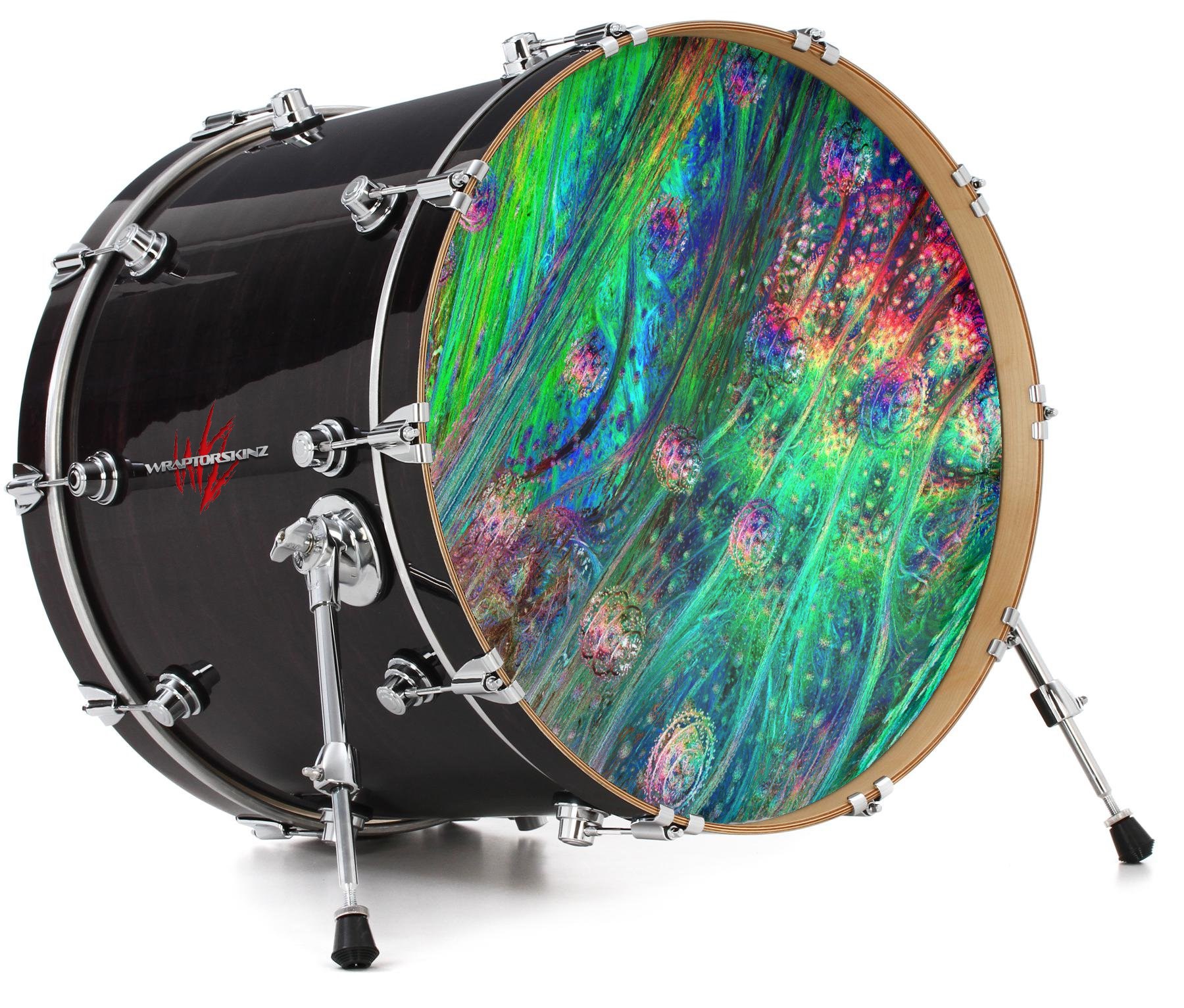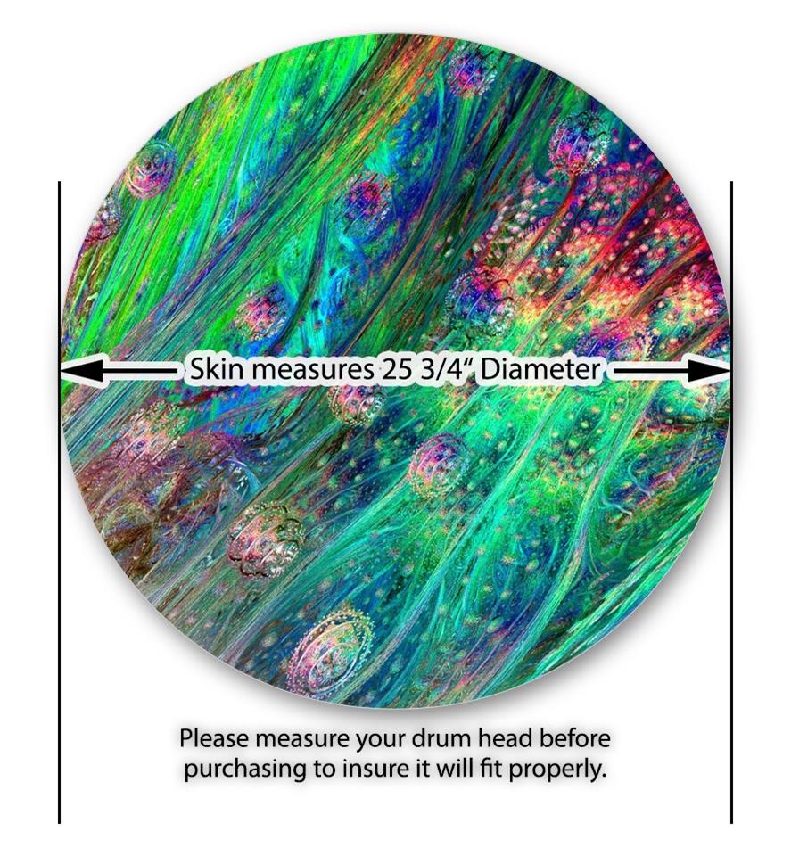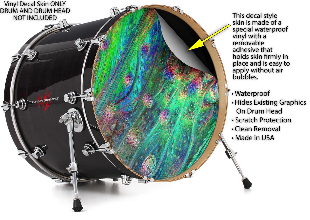 This design also available in other sizes. WraptorSkinz® skin wraps compatible with most kick drum heads. Printed using superb photo quality designs and vibrant colors printed with special fade resistant inks that last even in direct sun for years. WraptorSkinz are a composite three layer commercial grade materials vinyl. The bottom layer is a air release, grey block out removable adhesive that hides existing graphics on the drum head and is easily applied without air bubbles. The middle layer is a flexible vinyl printed with UV protected, fade resistant inks that deliver superb photo quality designs in vibrant colors. Finally, we bond a professional grade laminate over the entire skin adding a glossy protective finish.