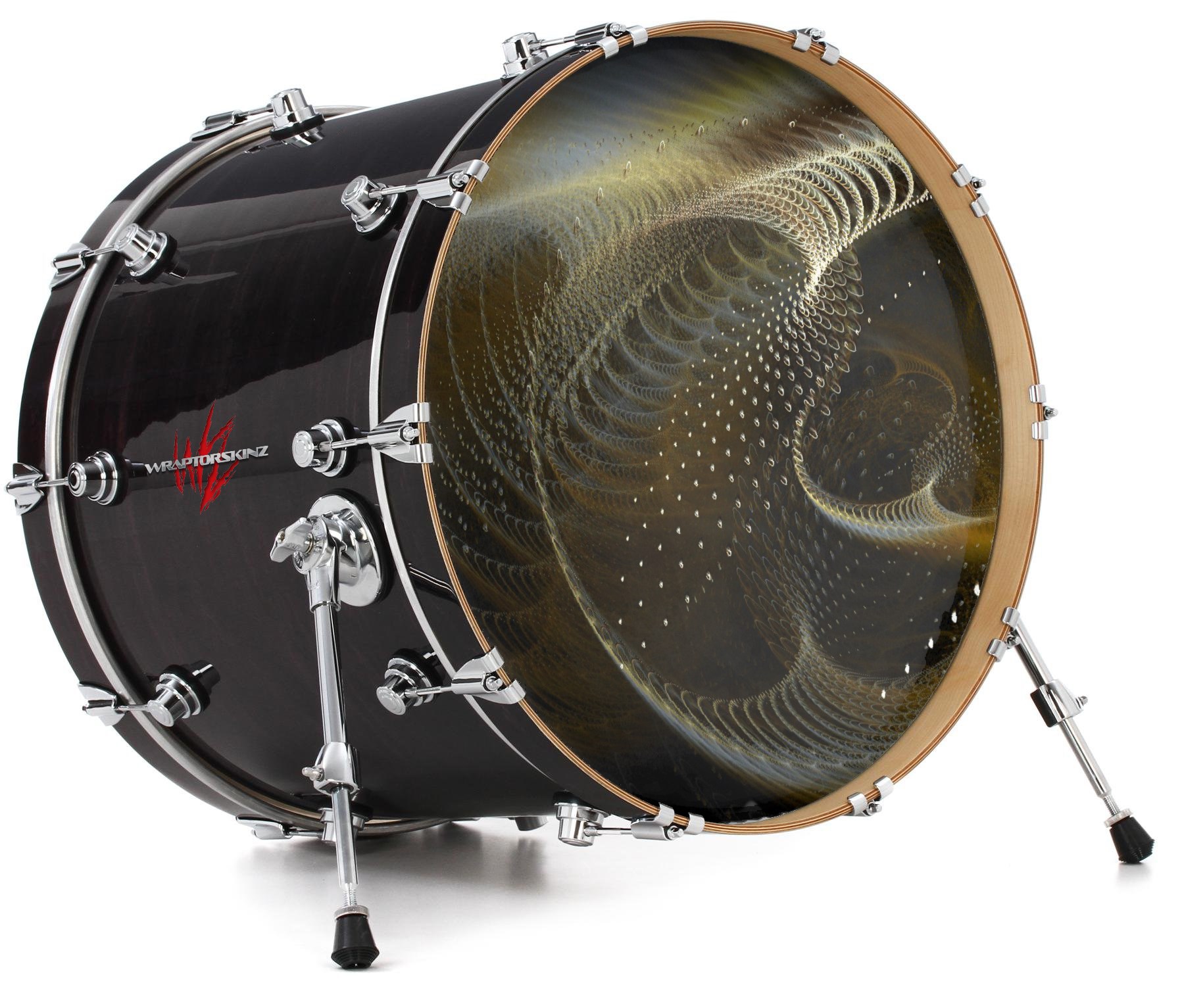This design also available in other sizes. WraptorSkinz® skin wraps compatible with most kick drum heads. Printed using superb photo quality designs and vibrant colors printed with special fade resistant inks that last even in direct sun for years. WraptorSkinz are a composite three layer commercial grade materials vinyl. The bottom layer is a air release, grey block out removable adhesive that hides existing graphics on the drum head and is easily applied without air bubbles. The middle layer is a flexible vinyl printed with UV protected, fade resistant inks that deliver superb photo quality designs in vibrant colors. Finally, we bond a professional grade laminate over the entire skin adding a glossy protective finish.