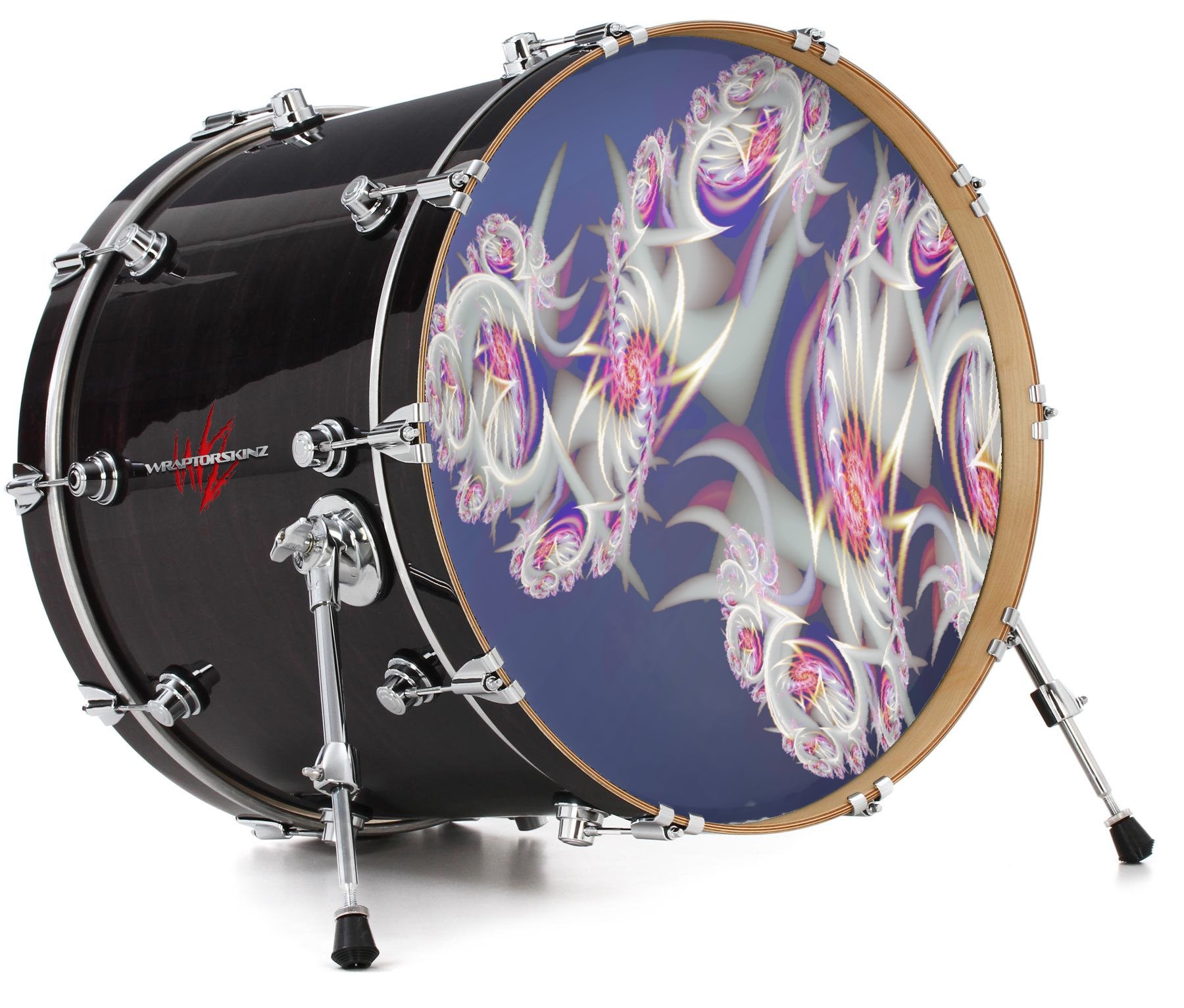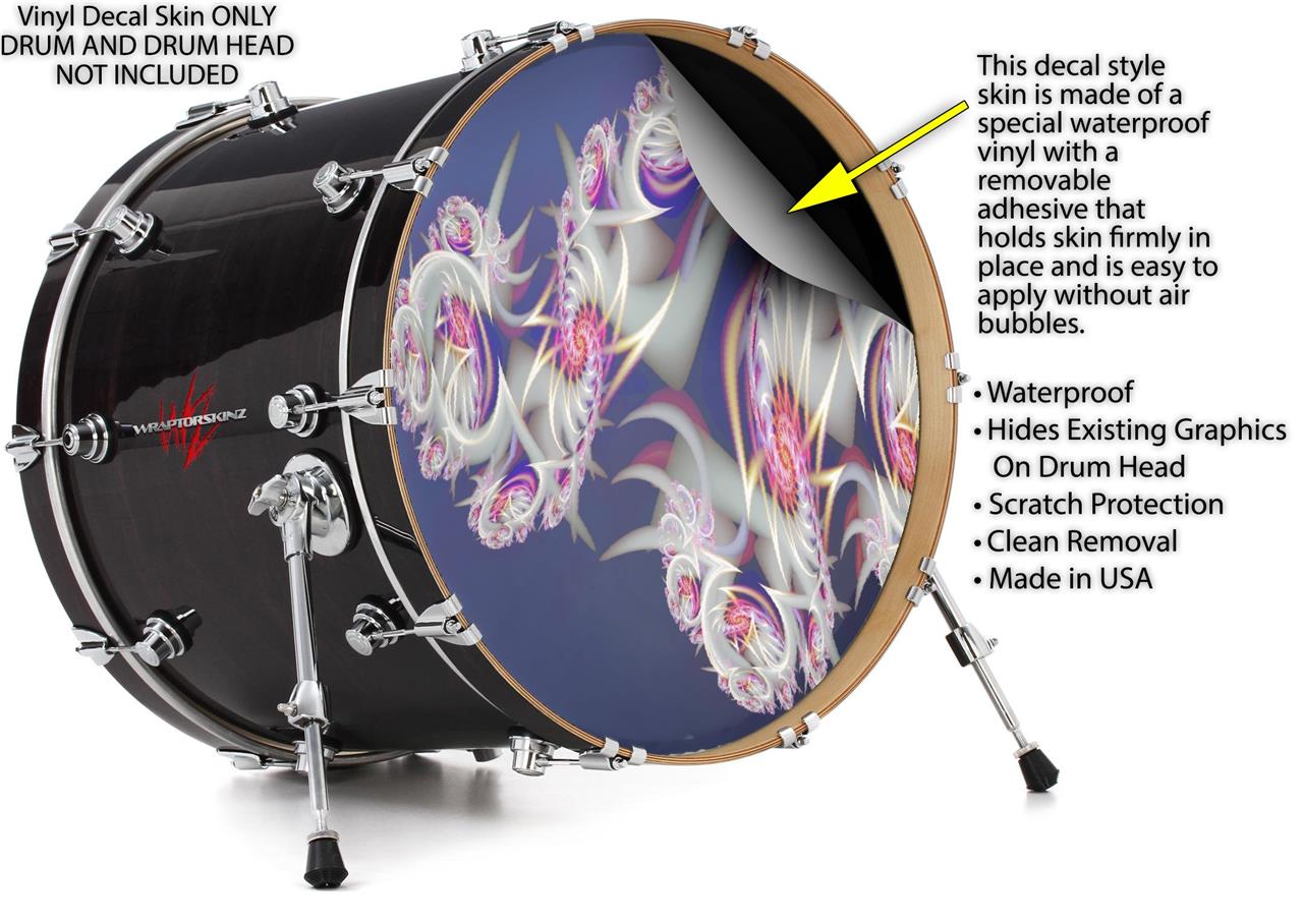This design also available in other sizes. WraptorSkinz® skin wraps compatible with most kick drum heads. Printed using superb photo quality designs and vibrant colors printed with special fade resistant inks that last even in direct sun for years. WraptorSkinz are a composite three layer commercial grade materials vinyl. The bottom layer is a air release, grey block out removable adhesive that hides existing graphics on the drum head and is easily applied without air bubbles. The middle layer is a flexible vinyl printed with UV protected, fade resistant inks that deliver superb photo quality designs in vibrant colors. Finally, we bond a professional grade laminate over the entire skin adding a glossy protective finish.
