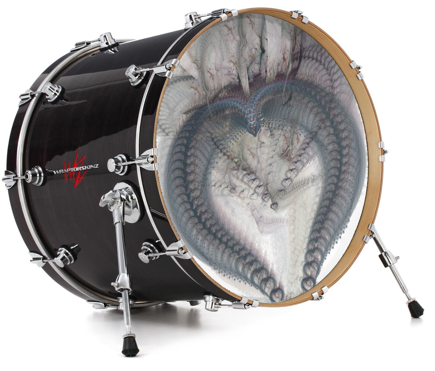 This design also available in other sizes. WraptorSkinz® skin wraps compatible with most kick drum heads. Printed using superb photo quality designs and vibrant colors printed with special fade resistant inks that last even in direct sun for years. WraptorSkinz are a composite three layer commercial grade materials vinyl. The bottom layer is a air release, grey block out removable adhesive that hides existing graphics on the drum head and is easily applied without air bubbles. The middle layer is a flexible vinyl printed with UV protected, fade resistant inks that deliver superb photo quality designs in vibrant colors. Finally, we bond a professional grade laminate over the entire skin adding a glossy protective finish.