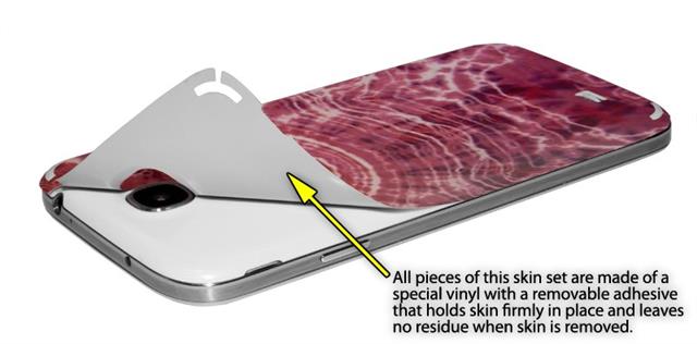 • Decal style vinyl skin covers front and back of Samsung Galaxy S4 phone.