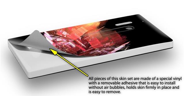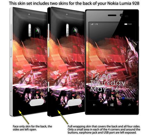 • Decal style vinyl skin covers front, back and side of Nokia Lumia 928 phone.