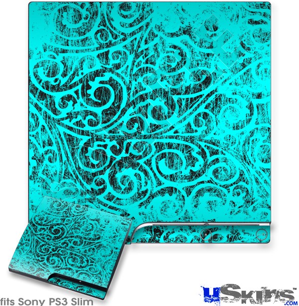 Decal Skin compatible with Sony PS3 Slim Folder Doodles Neon Teal